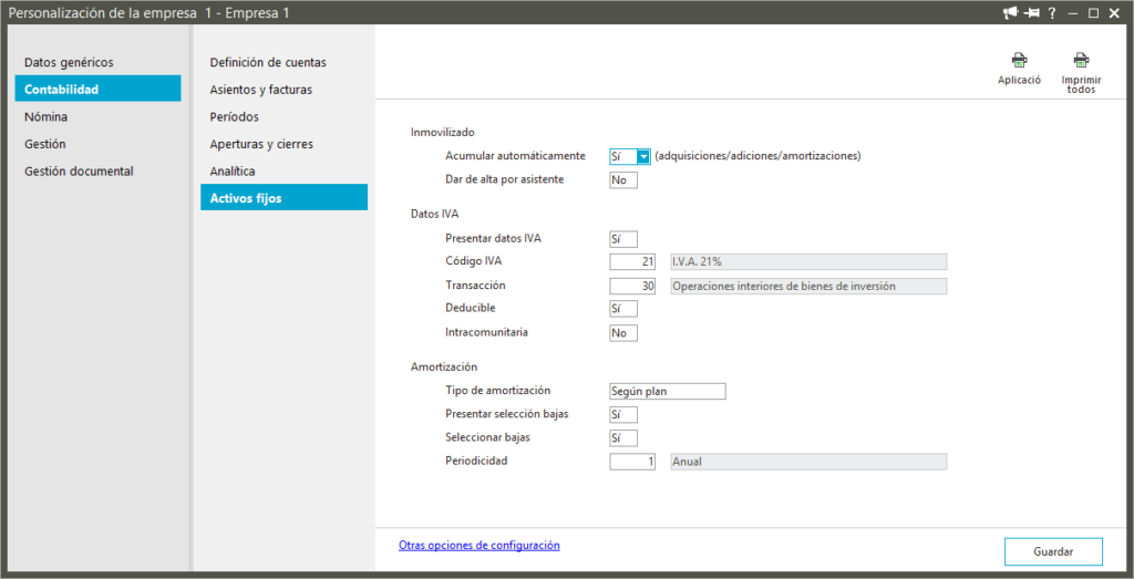 Gestiona los inmovilizados calculando la amortización según los diversos métodos legalmente admitidos; puedes calcular varios planes de amortización y registrar los cambios de ubicación y de responsabilidad sobre cada elemento; las amortizaciones a realizar las generas según la periodicidad definida en cada elemento, pudiendo realizar simulaciones. Y por supuesto, todas las acciones realizadas desde Activos Fijos aparecen automáticamente en Contabilidad.