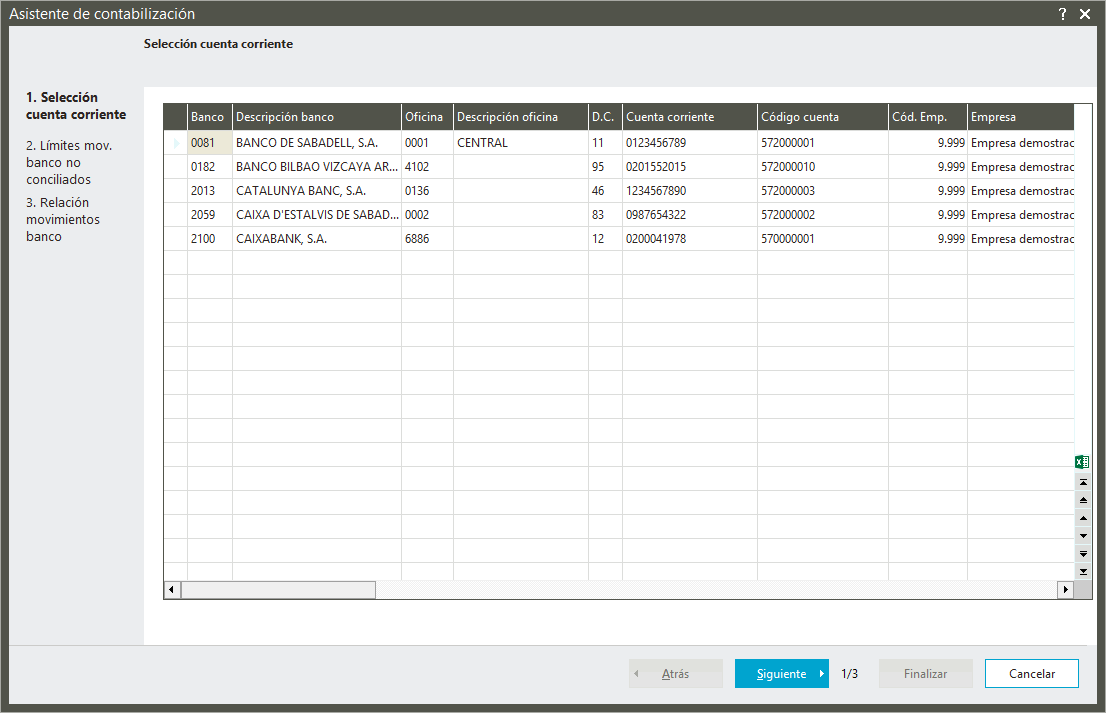 Conciliación. Gestiona el proceso sistemático de comparación entre el extracto bancario y los asientos contables de la cuenta corriente. La conciliación puede realizarse de forma manual o automática.